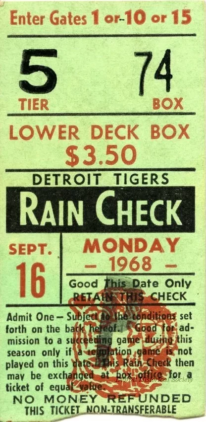 Request ImageTickets to a Detroit Tigers game against the New York Yankees at Tiger Stadium, Monday Sept. 16, 1968. Lower deck box, $3.50