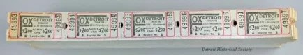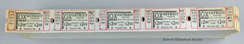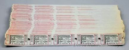 One bundle of tickets for a show at the Fox Theatre in Detroit. The tickets, numbered 49098 through 49997, are priced at $2.00 each and are printed in black text on light blue/gray heavyweight paper. Sale conditions are printed on the verso. The tickets are arranged in strips of five with the strips being folded back and forth in an accordion-style. The edge of each ticket has faint perforation marks and a single large hole at the center to allow for easy tear-off.
