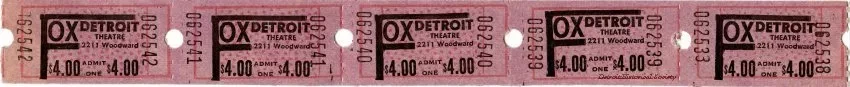One strip of five tickets for a show at the Fox Theatre in Detroit. The tickets, numbered 062538 through 062542, are priced at $4.00 each and are printed in black and red text on pale purple heavyweight paper. Sale conditions are printed on the verso. The edge of each ticket has faint perforation marks and a single large hole at the center to allow for easy tear-off.