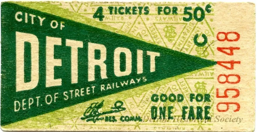 One "City of Detroit Dept. of Street Railways" ticket. The ticket is printed in light green, dark green, and red ink on heavy paper. The title text is shown in a dark green pennant design on both sides of the ticket. Additional printed text shows "4 Tickets For 50¢" and "Good For One Fare." The ticket number, "958448," is shown in red text.