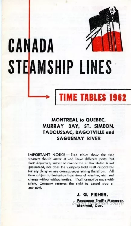 One "Canada Steamship Lines, Time Tables 1962." The foldout brochure is printed in red and black text on white paper and lists the various passenger cruises, destinations, schedules, and fares that were offered by the company for the 1962 season. The timetable covers only destinations on the St. Lawrence and Saguenay Rivers.
