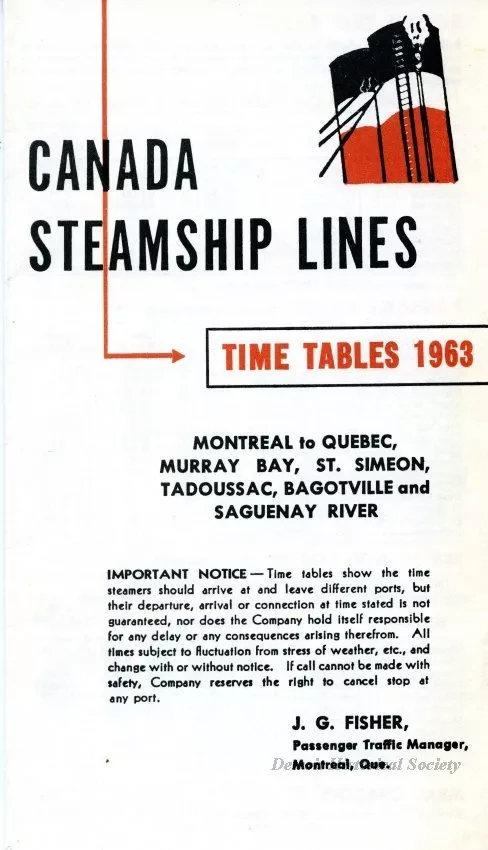 One "Canada Steamship Lines, Time Tables 1963." The foldout brochure is printed in red and black text on white paper and lists the various passenger cruises, destinations, schedules, and fares that were offered by the company for the 1963 season. The timetable covers only destinations on the St. Lawrence and Saguenay Rivers.