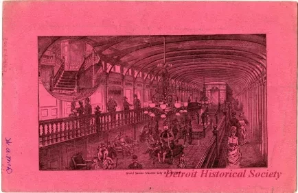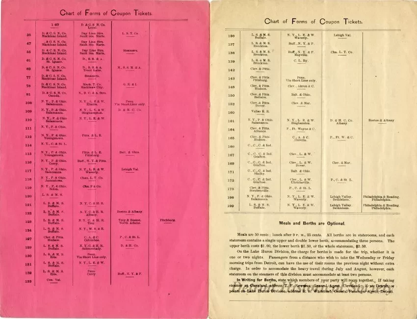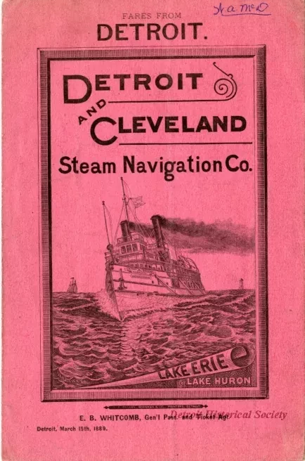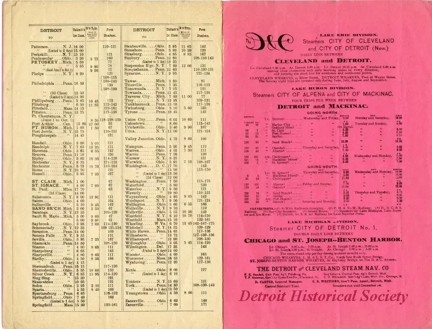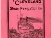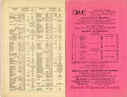 Detroit and Cleveland Navigation Company timetable in the form of a six page booklet with a salmon-colored cover. Cover bears an engraving of the bow of the CITY OF MACKINAC under steam, with a sailboat and lighthouse in the background. An engraving of the grand salon on the CITY OF CLEVELAND.