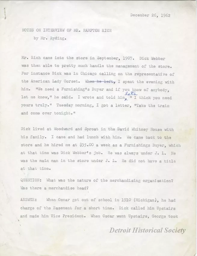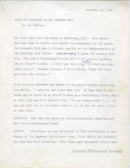 Seven page typewritten record of an interview with Hampton Rich concerning his employment as a buyer with the J.L. Hudson Company beginning in 1907, conducted by a "Mr. Ryding," dated December 26, 1962. Rich discusses the workings of his departments, co-workers, Hudson's World War I-era Military Shop, his involvement in redesigning the store's layout and the purchase of Newcomb Endicott.