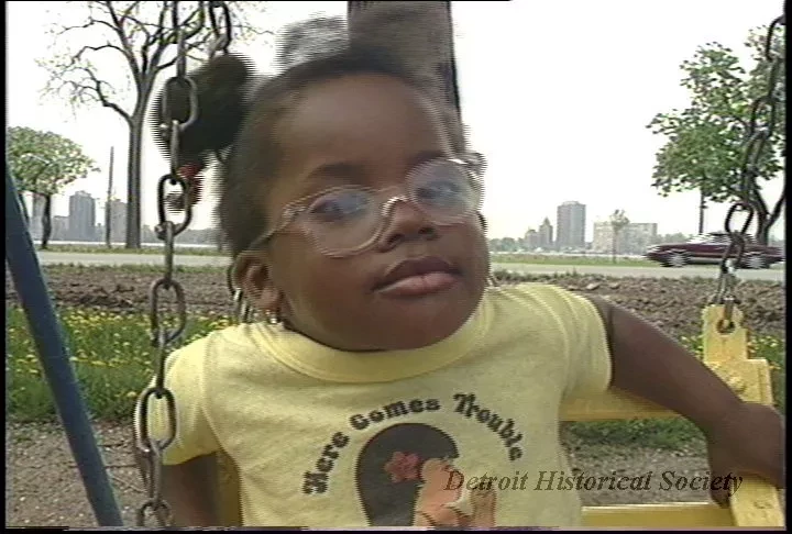 The next section of the tape takes place around the swing sets off the west side of Vista Drive on Belle Isle. Here the camera captures people waving while driving past, people relaxing on grass, children playing on the swings, and a man pushing a young child in a baby swing.
