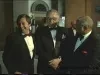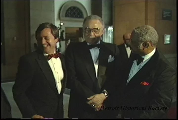 The tape opens with silent footage of Mayor Coleman A. Young, Governor James Blanchard, and Judge Damon Keith clad in tuxedos, standing side by side in the Woodward Avenue lobby of the Detroit Institute of Arts. Audio begins with a series of close-up of Mayor Young talking to off-camera people. Several similar shots follow, first of Blanchard, then of Keith. Crowd noises mask the exchanges.