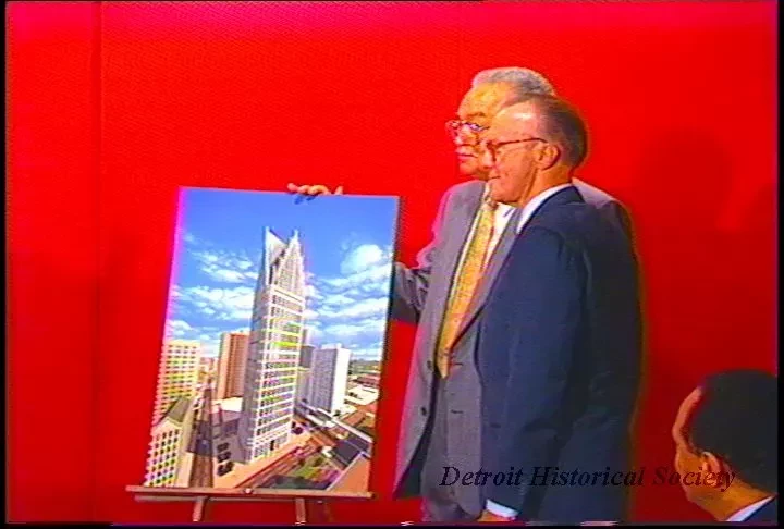 The newer recording begins as Mayor Coleman A. Young takes the podium at a press conference to discuss the Woodward Avenue One development (the eventual Comerica Tower/One Detroit Center building) from Gerald D. Hines, and to announce new tenants for the building.