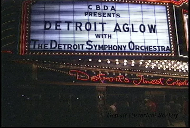 U-Matic S tape containing footage shot at the Fox Theatre before and during the November 19, 1990 performance of the Christmas-themed show Detroit Aglow with the Detroit Symphony, presented by the Central Business District Association, followed by a series of shots of pieces of children's artwork based around the theme of "My Heart Is With Detroit." These recordings were made over video of the 1990 press conference where Mayor Coleman A. Young honors U.S. Air Force Brigadier General Marcelite J. Harris, a portion of which remains at the end of the tape.