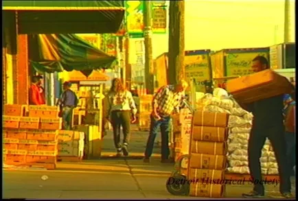 Then after another brief gap in the film, footage of the parade begins. A police motorcycle leads the group, followed by a pair of people carrying an "Eastern Market Centennial Fest" banner. They are followed by a Vietnam Veterans of America color guard, a horse-drawn carriage carrying Grand Marshal Sal Ciaramitaro, members of the Detroit Police Department's Mounted Police, the Detroit Fire Department's Ladder 7, a Detroit Fire Department clown group, and another fire truck. After a cut, a group of dancers on roller skates in matching black suits perform a routine. They are followed by a Detroit Metro Fruit Vendors Association banana cart, a group from the American Legion, another firefighter clown, and another Metro Detroit Fruit Vendors Association cart. MacKenzie High School's Band of Renown follows next. While the band approaches the camera turns to film several spectators. And as the band passes they can be heard performing Whitney Houston's "I'm Your Baby Tonight." They are followed by a 40 and 8 Voiture 1002 float in the form of a truck made up to resemble a blue train engine, pulling a caboose. Signs on the float read "Le Blue Goose," "Voiture 1002, Suburban Wayne County, Michigan, "Vote for Benji in '92," and "Benjamin Harrison Presidential Campaign Reenactment." After the train passes, the camera gets more shots of the crowd. The camera cuts back to the parade as a forklift carrying a crate of watermelons and pulling a cart of produce passes. A sign on the cart reads, "Wholesale Center District Council." Next a group of young people in police uniform--presumably the Detroit Police Department's Junior Cadet Corps--march past. They are followed by another group of young people holding signs with historical information about 1891. Two people in large pig masks march among them. Next from the center of the street, the camera films as the Crestwood High School marching band from Dearborn Heights marches past. A clown and a group of children in matching Alexis Company shirts then perform a cheer for the camera. They are followed by two people in eagle mascot costumes. After more shots of the crowd, a car pulls a small float containing a jazz quartet seated on pallets. The camera then cuts to the Eastern Market Merchant Association float consisting of a giant cake on a trailer pulled by a truck. People in large flower costumes pass next, followed by a float promoting Flower Days. This float consists of a truck pulling a flower cart with a sign providing the dates of flower days. The float is followed by a group of cheerleaders clad in black and red, a group of Boy Scouts, and the Martin Luther King High School marching band performing Sam and Dave's "Hold On, I'm Comin'." After a cut, filming resumes with the Detroit Department of Transportation's mascot dancing past the camera, ahead of a group of Boy Scouts, and Buttercup the clown in a tiny car. A calliope then travels past, playing "You Are My Sunshine," and "When the Saints Go Marching In." After another cut, a clown attempts to hand a bedpan to the driver of a passing Pepsi truck. The parade footage wraps up with shots of the crowd, and announcer Mal Sillars on a platform adjacent to the route.