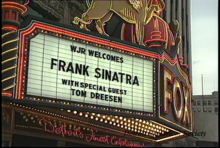 The tape opens with footage shot of the Woodward Avenue entrance to the Fox Theatre, as people enter for a Frank Sinatra concert. The marquee is illuminated. Among the traffic on Woodward Avenue are several limousines, a charter bus, and a bus patterned after a streetcar. Attendants are filmed helping people exit the limousines as they arrive. A poster near the theater's entrance promotes an upcoming Muppet Babies live show.