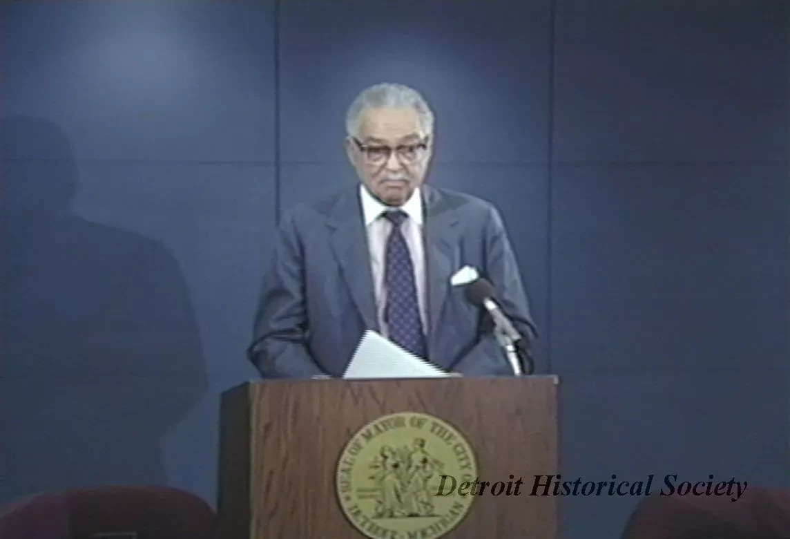 Afterward, Young opens the floor to questions from the press, who can be heard from off camera while it remains trained on him for his answers and reactions. Regarding the impact of his health on the decision, Mayor Young explains that he refuses to speculate about what decision he would make under different circumstances. He also states that it is too soon for him to endorse any of the other candidates. He also states that he reached the decision about not seeking re-election the night prior. When asked, he also expresses that he has no regrets about the decision. With a chuckle, he says that the qualities possessed by the next mayor should be "love for the city, and a thick skin." He next says the proudest moment of his administration was the passage of the referendum by the voters to raise the income tax in 1982 to balance the city's budget. He does not have the answer to whether Charlie Williams will run for mayor. He says that his meeting with appointees was not emotional, then jokes with the reporter about whether they get emotional. He also briefly expresses his wishes for how he wants to be remembered, jokes about the "perks" of office and of being a private citizen, and expresses that he still has this job for six more months and will be focusing on that. He then handles a series of short questions about plans for a new stadium for the Detroit Tigers, the future of casino gambling in the city, and his message for people glad to see him go. When pressed about "sad moments" of his term, he speaks about the hounding by federal authorities and the press of Chief William Hart and the Executive Deputy Frank Blount, and money and effort that went into the investigation of city contracts with Vista Disposal Incorporated. When asked about Detroit's perpetual state of crisis, he retorts by saying the Detroit has been caught up in national crises. He then speaks about the growing inclusion of African Americans and women in city government under his administration. When asked about his poor relationship with the suburbs, he says it is a "bum rap," and cites his establishment of the tri-county conference of mayors. He also contrasts his policy of maintaining a 50-50 ratio of white and African American people on his staff while his city is 80% African American, to discrimination in the suburbs, and charges the press ought to focus on that latter phenomena. He then speaks briefly about labor and race. When asked about the future of federal investigations into the city, he replies that questions about further federal investigation into the city are better directed to the Attorney General. He again jokes about how he wants to be remembered historically. And when asked about criticism of President Bill Clinton by the U.S Conference of Mayors he concurs. He says he hopes to have more impact on the issues of the next election than the editorial pages of the newspapers do. He is then asked several questions about Charlie Williams, although neither he nor the press are sure if he applied to run. The tape ends as Young talks about his recent dealing with Governor John Engler in regard to gambling and the polluted Uniroyal site on the riverfront.