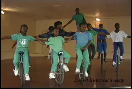 Several shots follow featuring members of the Detroit 4-H Unilights Unicycle Club riding indoors while wishing the mayor a happy birthday.