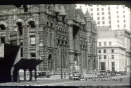 The first shot is a a pan up the Barlum Hotel as shot from Cadillac Square to the southeast. This is followed by a northward facing view along East Congress Street as shot from an elevated position east of Randolph Street. The Reid Building, the First National Building, and the Guardian Building are all in view. In the new shot, presumably shot from J.L. Hudson Company department store, the camera pans from a shot of the skyline and rooftops to the southwest--including the Dime Building and the Penobscot--down to pedestrians walking along Merchants Row on the west side of Woodward Avenue between Grand River Avenue and State Street. In the following shot, the camera points northwest along Fort Street from the left side of the street between Shelby Street and Washington Boulevard. Portions of the Penobscot, the First National Building, the Barlum Hotel, the Dime Building, and the Federal Building and Post Office are in view. The Federal Building and Post Office is the subject of the following shot, as the camera pans up the building's tower from the center of Fort Street to the southwest. This is followed by two more brief shots along Fort Street west from Washington Boulevard. The following shot is from the southeast corner of Washington Boulevard and Michigan Avenue, taken facing to the east. The Book-Cadillac Hotel, the People's Outfitting Company Building, the Majestic Building, and the Barlum Hotel are among the structures visible here. Three brief shots of sidewalks crowded with people follow.