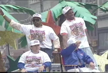Following another cut, the motorcade approaches, led by police cars, and a police color guard carrying American, Michigan, and Canadian flags. The Blue Pigs begin performing Michael Jackson's Bad, but the sound is soon after drowned out by the "Sweep L.A." song, and the Mackenzie High School marching band. The marching band is followed by a Detroit Pistons tour. Behind the tour bus is another school marching band--presumably Dearborn Edsel Ford--with the initials "E.F." on their black and white uniforms. They are followed by several convertibles carrying Pistons staff, and a group of gymnasts with ribbons, and the cheerleaders of the Mid American Pompom All Star Team. Vinnie Johnson and Dennis Rodman ride behind them on a Los Angeles-themed float, decorated with palm trees, a giant box of popcorn, and film reels. As the float approaches, members of the crowd can be heard doing the dog pound chant, made popular by the Arsenio Hall Show. Behind the float, members of the Detroit 4-H Unilights Unicycle Club can be seen. When the float reaches the end of the route, the players climb off and make their way to the bridge over Larned on foot, pausing to interact with fans along the way. Dennis Rodman can be seen stopping to talk with WJBK sports reporter Eli Zaret at the foot of the bridge, as recorded on tape 2015.008.052, as well as Mayor Coleman A. Young's press secretary Bob Berg.