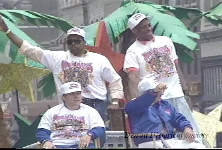 The Detroit Rockin' Rollers roller skating club follows behind the roadster float. And next in the parade is a float in the shape of a pirate ship. Among this float's passengers are Bill Laimbeer and Rick Mahorn, who both hold brooms. To the rear of this float is the Ann Arbor Trail marching band. The tape abruptly ends, with the parade continued on tape 2015.008.031.