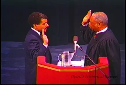 After a brief gap in the tape, the footage of Conrad Mallett, Jr.'s oath of office ceremony at the Detroit Institute of Arts begins. The footage is shot from a high vantage point by a hand-held camera. The footage begins with Mayor Coleman A. Young addressing an audience from behind a podium. Mallett sits with his family and several other justices to the left of the podium. Young notes that both Conrad Mallett, Jr., and his father have a long history of service to the city.