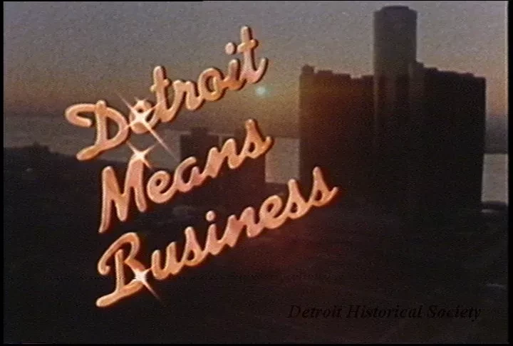 U-Matic tape containing the c. 1982 version of the promotional film "Detroit Means Business," produced by the Urban Communications Group for the Detroit Department of Public Information and the Community and Economic Development Department.