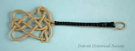 One carpet beater. The small-sized beater is made of a reed that has been woven into a decorative shape to form a flat beater. The two reed ends have been wrapped together with black tape to form a long handle. A short hanging loop is located at handle end.