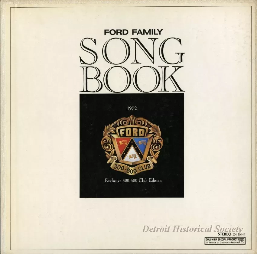 One stereo record album entitled, "Ford Family Song Book." The album cover has black title text on a white background. A multicolor drawing of a shield emblem is shown beneath the title and includes text that reads "1972, Ford 300-500 Club, Exclusive 300-500 Club Edition." The clamshell-style album box opens along the left edge and printed text on the inside cover gives a brief description of the 300-500 Club. The right side of the box contains a 12-page softcover booklet which has the same title and shield emblem as shown on the album cover. Additional text along the bottom of booklet shows "Exclusive Edition for 1971 Ford 300-500 Club Members." The booklet contains the words to 40 popular songs. All of the songs have been recorded by various artists on the four black vinyl records that are contained in separate white paper sleeves. This special album and records were produced by "Columbia Special Products, A Service of Columbia Records."