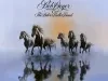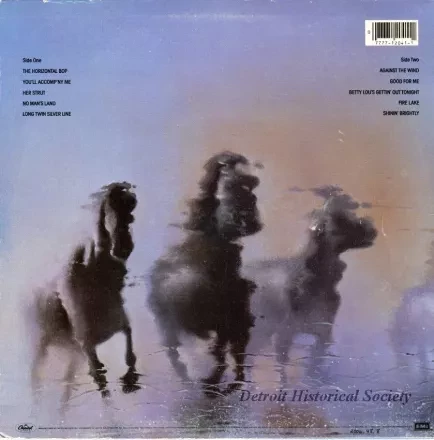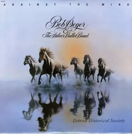 Bob Seger and the Silver Bullet Band LP, "Against the Wind," released by Capitol Records, featuring the songs "Against The Wind," "Fire Lake," "You'll Accomp'ny Me," and "The Horizontal Bop." The cover features an image of five horses running through water. The inner record sleeve is printed with lyrics and photos of the band members.