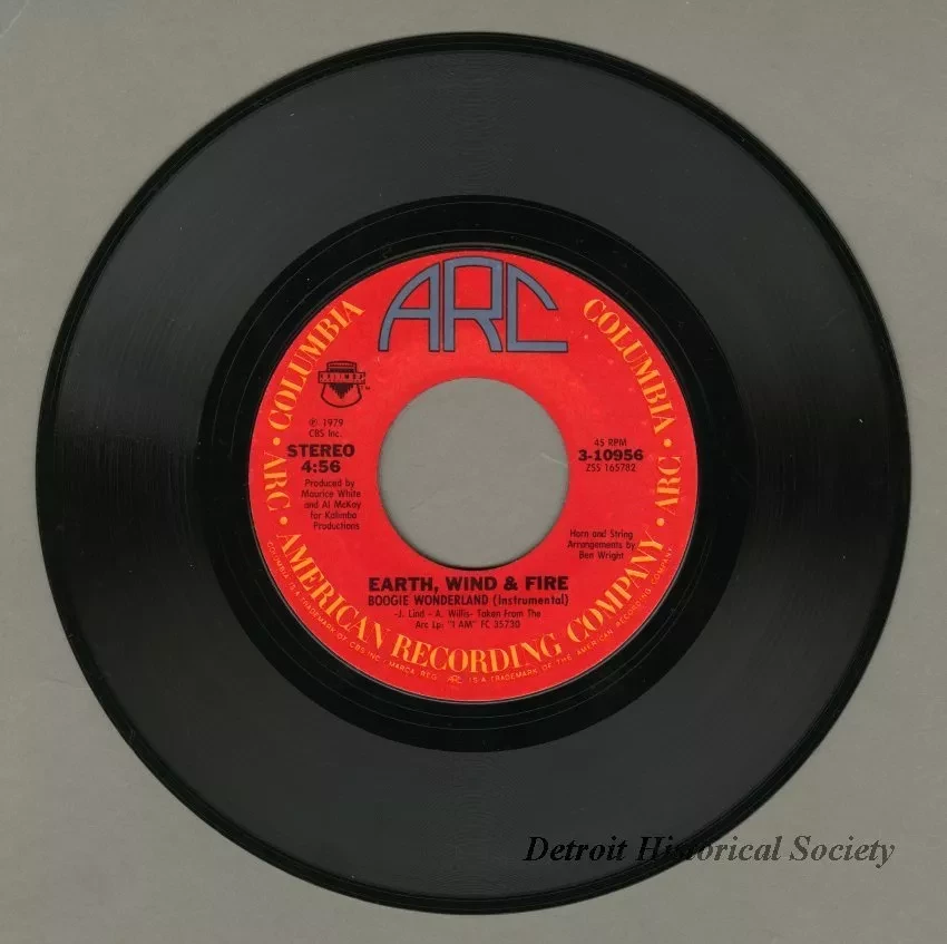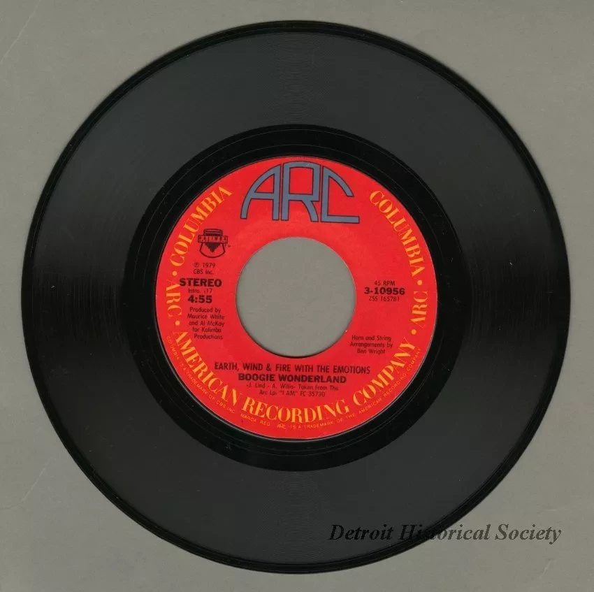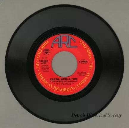 Earth, Wind & Fire with The Emotions "Boogie Wonderland" 45 RPM single, released by the American Recording Company. The song was co-written by Allee Willis. An instrumental version is on the B-side. The record has a red American Recording Company label and a white sleeve.