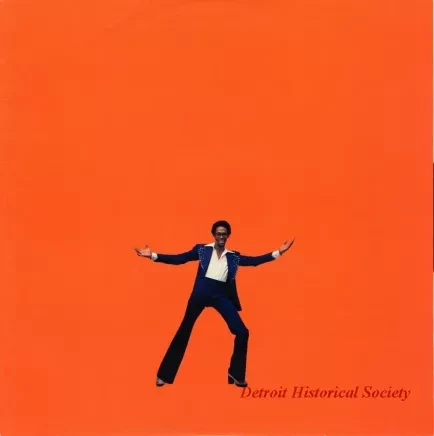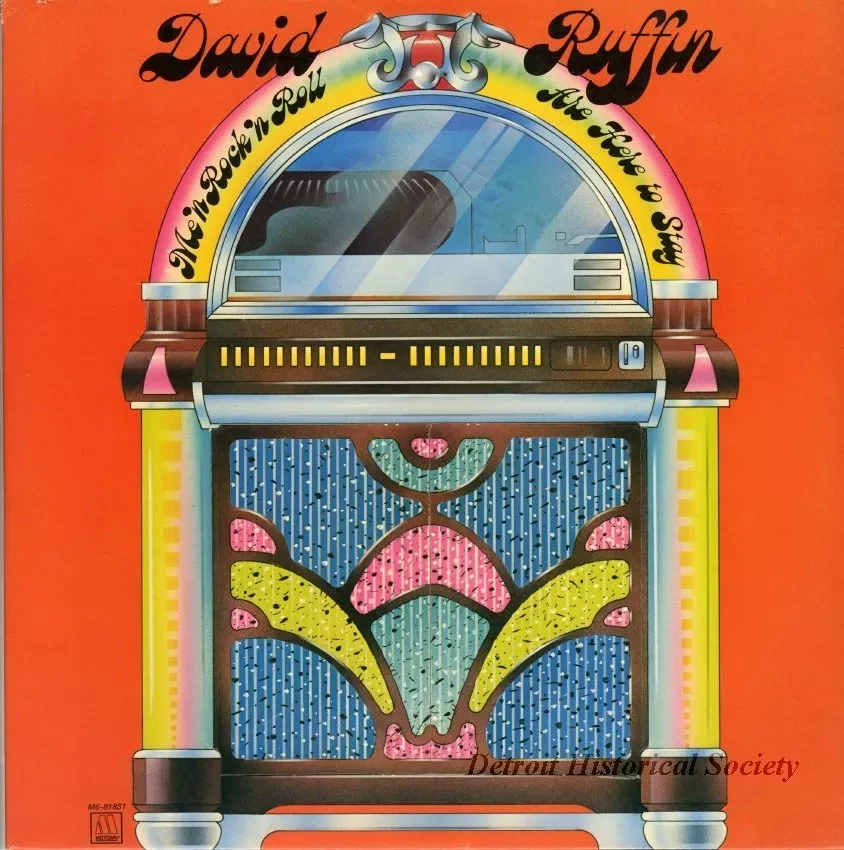David Ruffin, "Me 'n Rock 'n Roll Are Here To Stay," LP released by Motown Records, 1974, features the tracks, "I Saw You When You Met Her," "Me 'N Rock 'N Roll Are Here to Stay," and "I Just Want to Celebrate." A multi-colored oversized jukebox is featured on the orange LP cover; two die-cut flaps on the jukebox open to reveal the image of David Ruffin, dancing in a leisure suit on the orange record sleeve. A complete track listing and producer notes are featured on the backside of the sleeve. Featured on the back of the LP jacket is the backside of the jukebox, and the backside of a dancing David Ruffin.