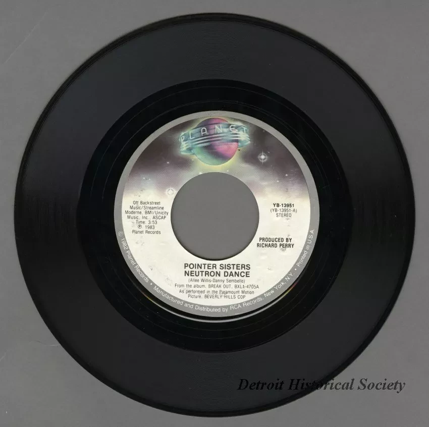 Pointer Sisters "Neutron Dance"/"Telegraph Your Love" 45 RPM single, released by Planet Records. "Neutron Dance" was co-written by Allee Willis. The record has a Planet Records label, and is housed in a white sleeve. A jukebox label is included inside the sleeve.