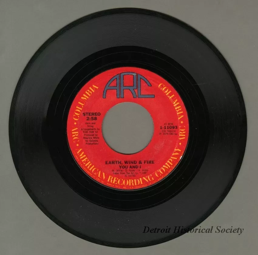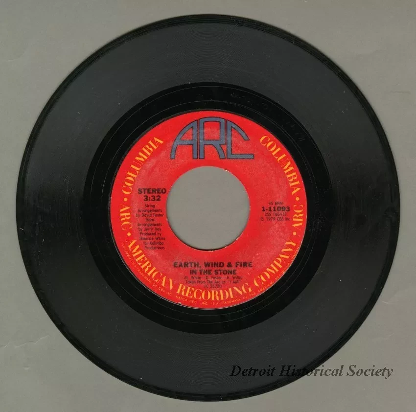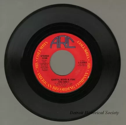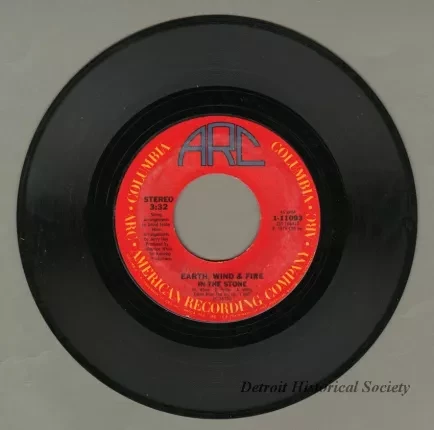 Earth, Wind & Fire "In The Stone"/"You and I" 45 RPM single, released by the American Recording Company. Both songs were co-written by Allee Willis. The record has a red American Recording Company label and a beige sleeve.