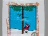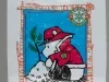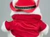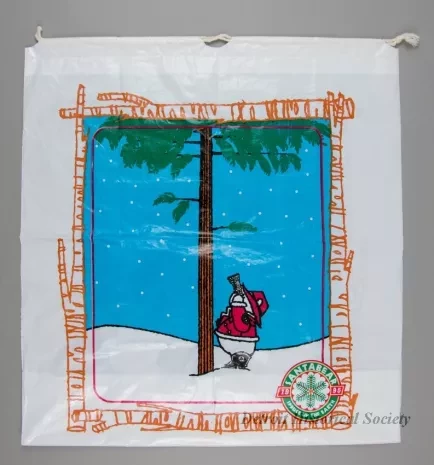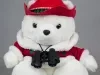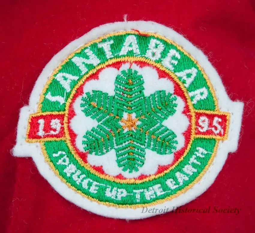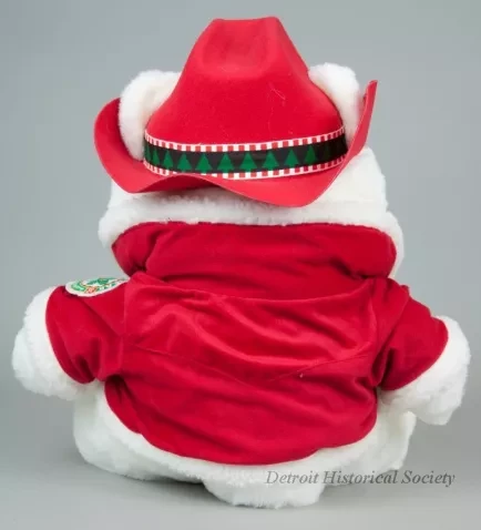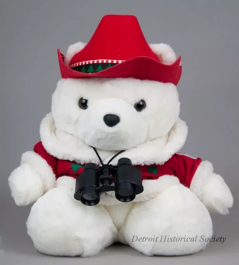 One Santa Bear stuffed animal which was sold as a promotional item by the Dayton Hudson Company as part of their 1995 Christmas holiday marketing campaign. The teddy bear toy is made of white polyester fiber with black plastic eyes and a black plastic nose. It is wearing a red felt western style hat with a red/green/white tree pattern headband. It is also wearing a red fabric jacket that has two metal snaps at the center front and is trimmed with simulated sheepskin along the collar, cuffs, and bottom edge. A multi-color embroidered patch on the left sleeve has white text that reads "Santabear, 1995," and "Spruce Up the Earth." Inside the back of the jacket, there is a small illustrated book entitled "Santabear Conservation Corps Log Book, 1995." A small pair of black plastic binoculars is hanging around the neck in front from a black cord. A white fabric tag on the underside has black text that shows the manufacturer's name, address, material description, and registration details. The bear comes with a white plastic bag that is printed with multi-color images of Santabear on the outside and has a white drawstring at the top.