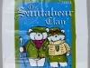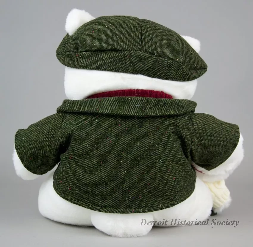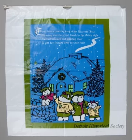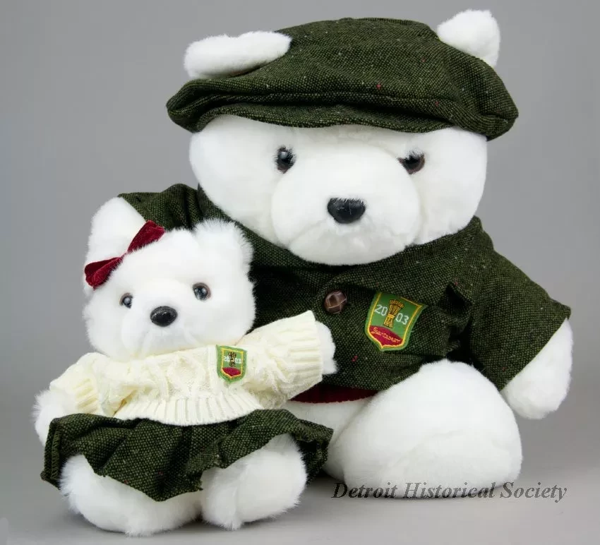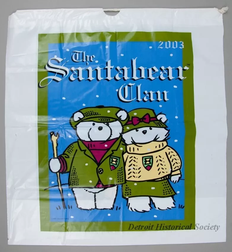One Santa Bear stuffed animal which was sold as a promotional item by Marshall Field & Company (formerly Hudson's) as part of their 2003 Christmas holiday marketing campaign. The toy teddy bear and cub are made of white polyester fiber with black plastic eyes and each with a black plastic nose. The bear is wearing a green/brown Irish tweed cap, a dark red knit sweater, and a matching tweed jacket. The left jacket breast has a green/gold/white embroidered patch that shows a bundle of wheat stalks and text that reads "2003, Santabear." In its right arm, the bear is holding a female teddy bear cub that has a red bow on her head and is dressed in an Irish fisherman's sweater along with a green/brown tweed pleated skirt. White fabric tags on the undersides of each stuffed animal have black text that show the manufacturer's name, address, material description, and registration details. The bear comes with a white plastic bag that is printed with multi-color images of Santabear on the outside and has a white drawstring at the top.