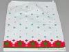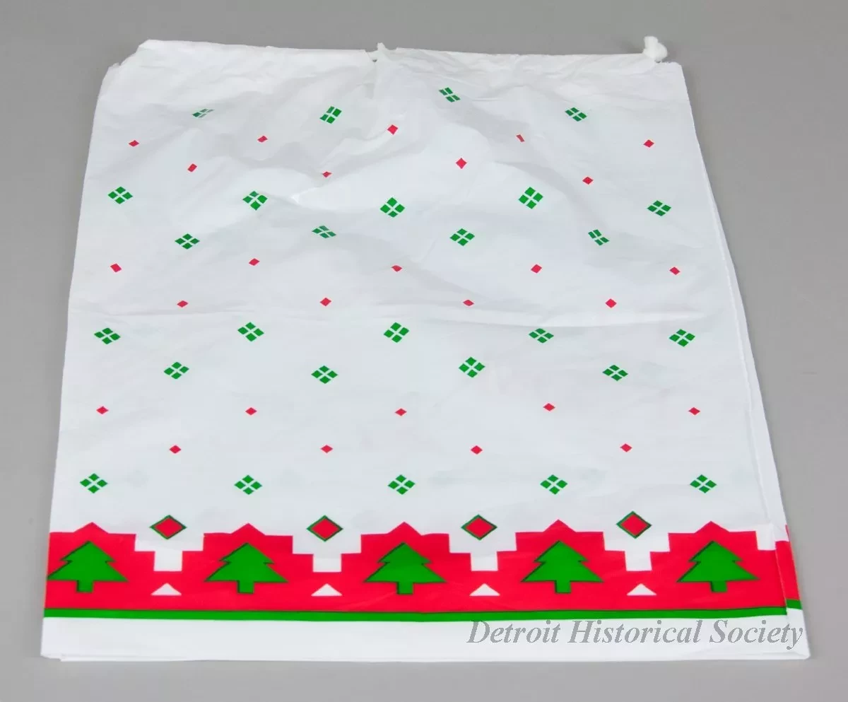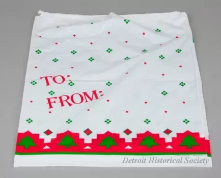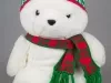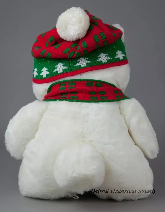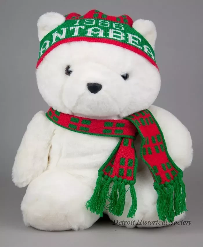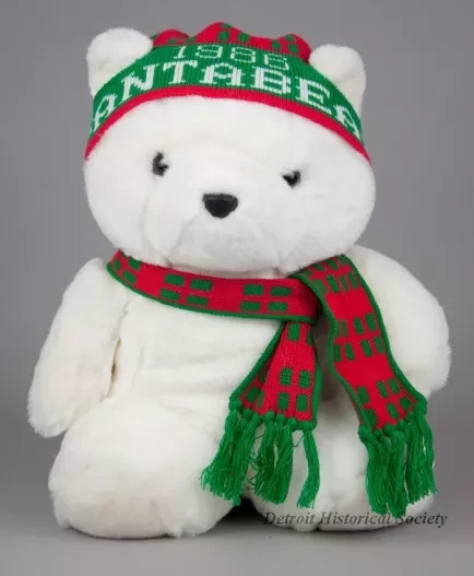 One Santa Bear stuffed animal which was sold as a promotional item by the Dayton Hudson Company as part of their 1986 Christmas holiday marketing campaign. The teddy bear toy is made of white polyester fiber with black plastic eyes and a black plastic nose. It has a removable red/green knit cap with white lettering that reads "1986 Santabear," and a matching knit scarf with green fringe on the ends. A white fabric tag on the underside has black text that shows the manufacturer's name, address, material description, and registration details. The bear comes with a white plastic bag that is printed with a red/green holiday design on the outside and has a white drawstring at the top.