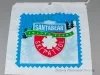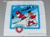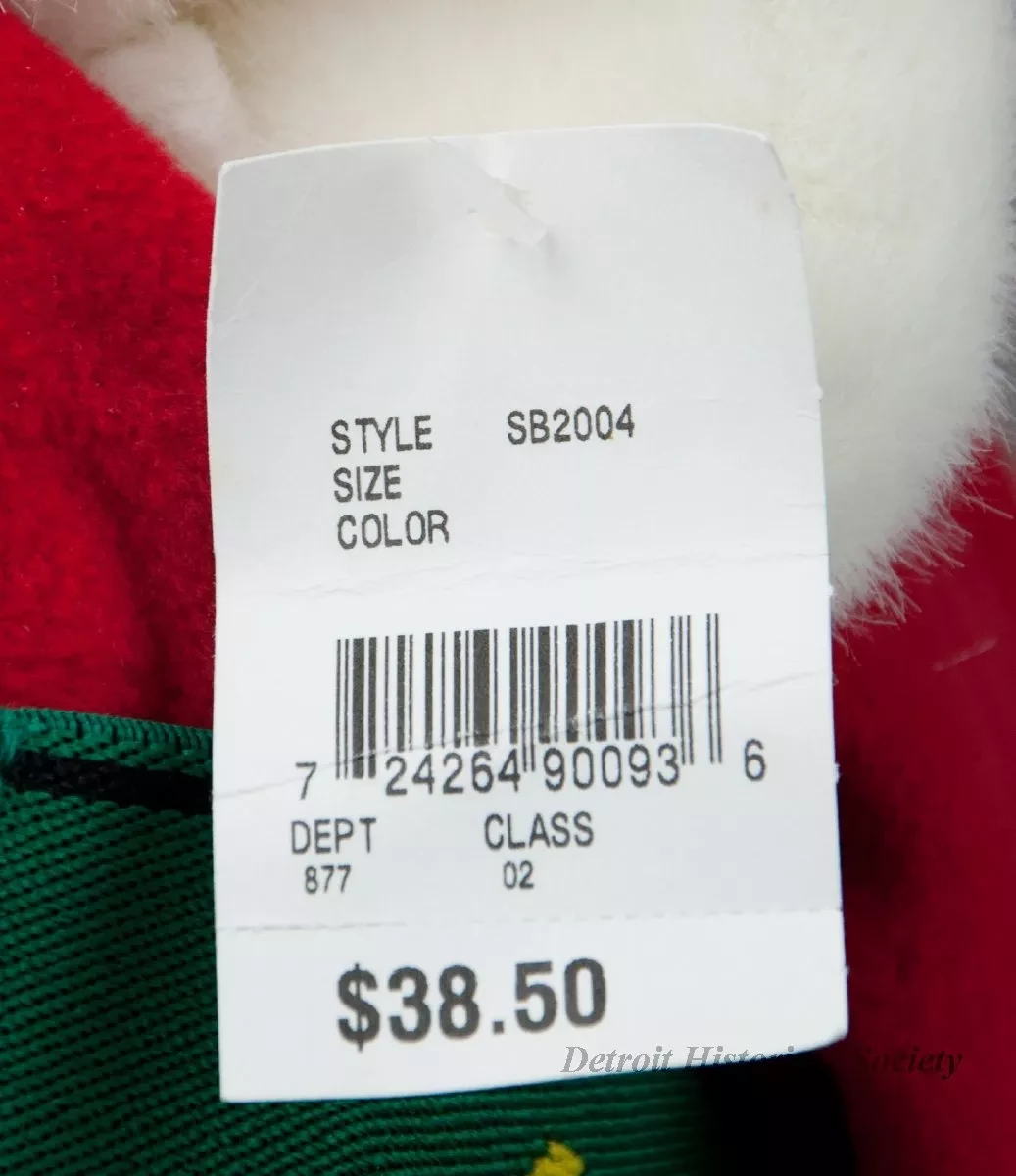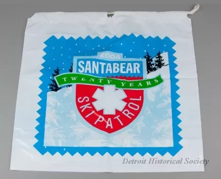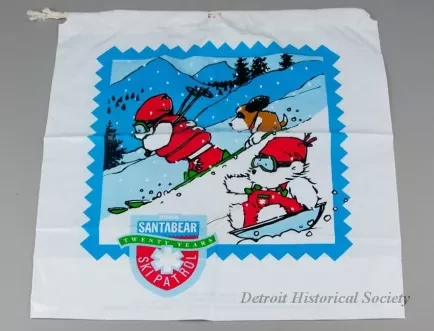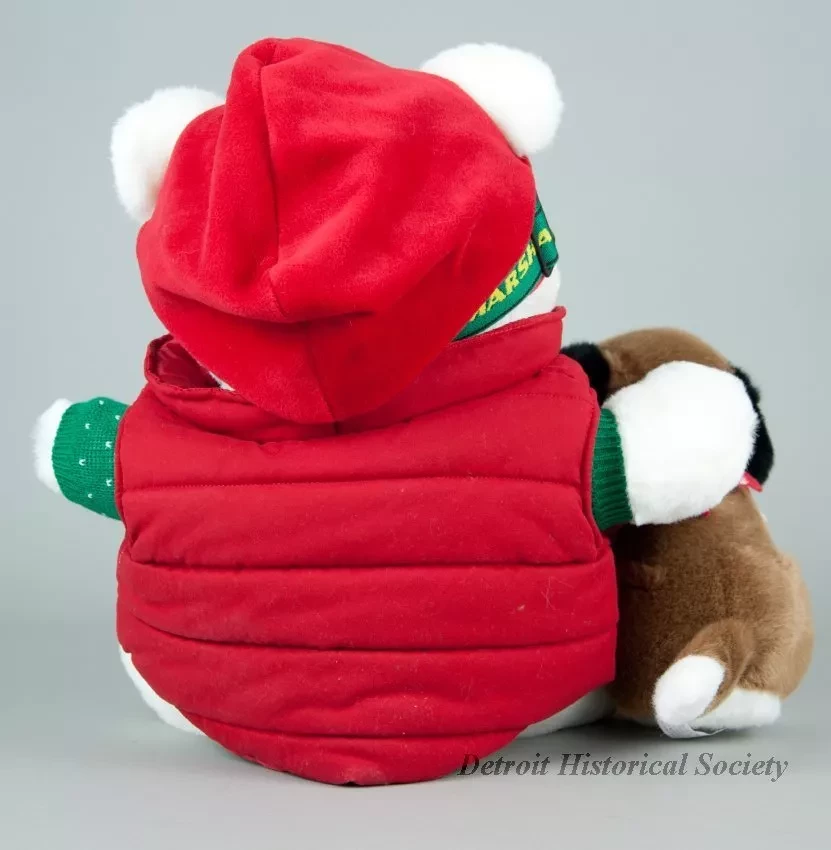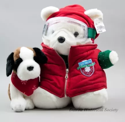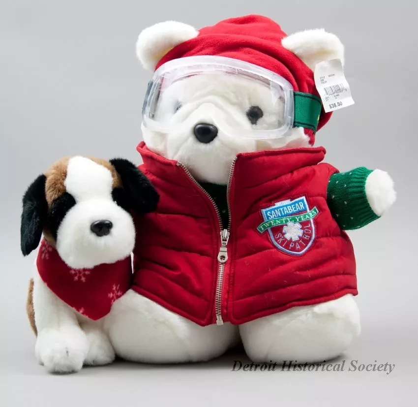 One Santa Bear stuffed animal which was sold as a promotional item by Marshall Field & Company (formerly Hudson's) as part of their 2004 Christmas holiday marketing campaign. The toy teddy bear is made of white polyester fiber with black plastic eyes and a black plastic nose. An accompanying small dog is made of white/brown/black polyester fiber with black plastic eyes and a black plastic nose. The bear is wearing a red fleece fabric ski hat and clear plastic ski goggles as well as a green knit sweater with a sleeveless red nylon ski jacket. The ski jacket has a metal zipper down the center front and an embroidered patch on the left breast that reads "2004, Santabear Ski Patrol," and "Twenty Years." A paper tag on the left ear shows a price of $38.50. With its right hand, the bear is petting a small seated dog that has a red fleece bandanna around its neck. White fabric tags on the undersides of each stuffed animal have black text that show the manufacturer's name, address, material description, and registration details. The bear comes with a white plastic bag that is printed with multi-color images of Santabear on the outside and has a white drawstring at the top.
