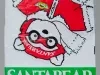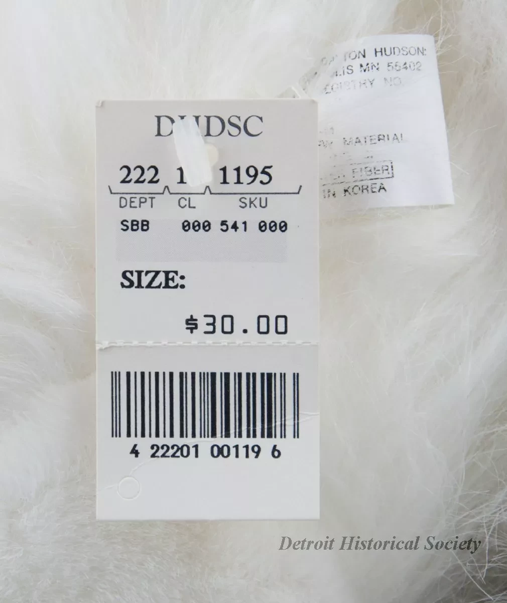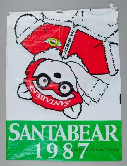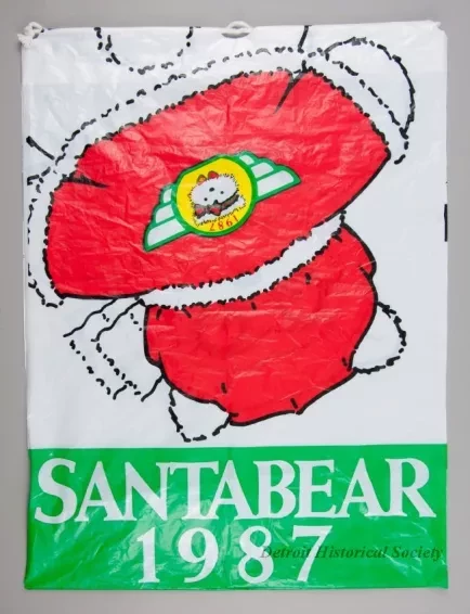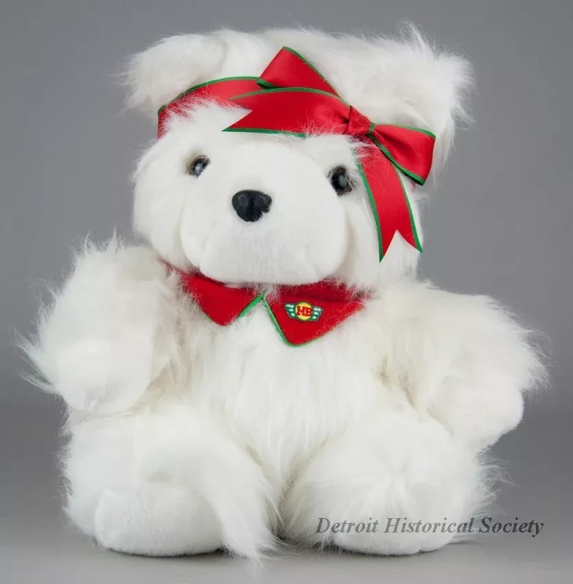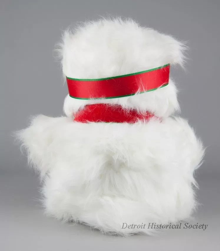 One Miss Bear stuffed animal which was sold as a promotional item by the Dayton Hudson Company as part of their 1987 Christmas holiday marketing campaign. The toy teddy bear is made of long white polyester fiber with black plastic eyes and a black plastic nose. It is wearing a red/green ribbon headband with a bow at the front. It also has a red velour collar with has narrow green piping along the edges. A small multi-color embroidered aviator emblem on the left collar shows the letters, "MB [Miss Bear]." A white plastic tag on the underside of the bear has black text that shows the manufacturer's name, address, material description, and registration details. An attached paper tag shows a price of $30.00. The bear comes with a white plastic bag that is printed with a multi-color Santabear image on the outside and has a white drawstring at the top.