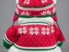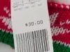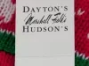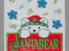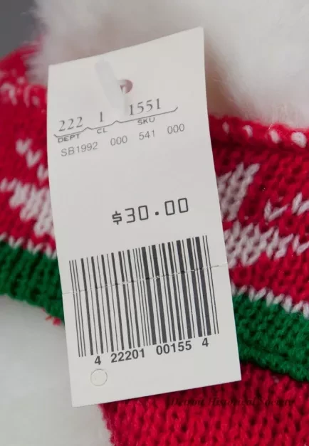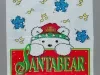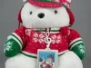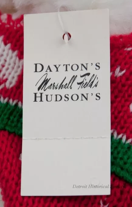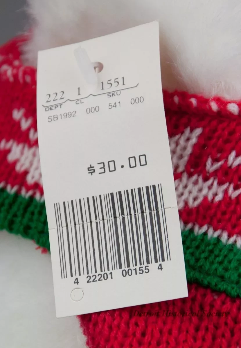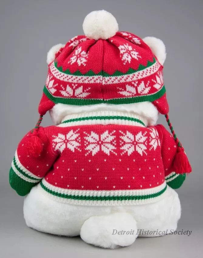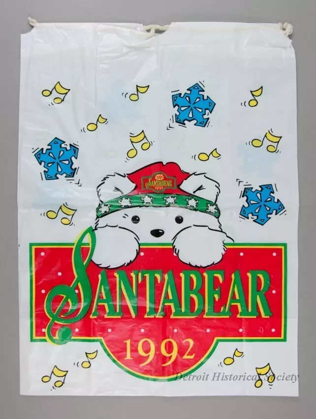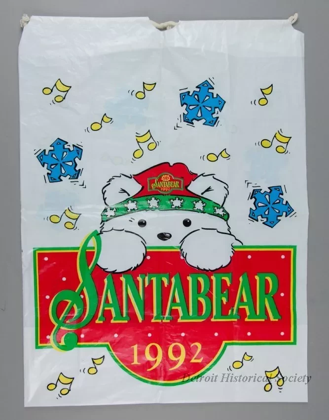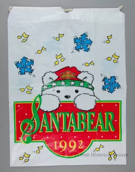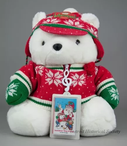 One Santa Bear stuffed animal which was sold as a promotional item by the Dayton Hudson Company as part of their 1992 Christmas holiday marketing campaign. The teddy bear toy is made of white polyester fiber with black plastic eyes and a black plastic nose. It is wearing a red/green knit cap that has a Nordic style white snowflake pattern and an embroidered patch on the front that reads "Santabear, 1992." It is also wearing a matching red/green/white knit sweater and green knit mittens. The sweater has a zipper down the center front with a decorative metal zipper pull in the shape of a treble clef. An unopened white paper and clear plastic box is attached to the front of the sweater that contains a cassette tape entitled "Santabear Sing-A-Long by Joe Scruggs." A white fabric tag on the underside has black text that shows the manufacturer's name, address, material description, and registration details. The bear comes with a white plastic bag that is printed with multi-color images of Santabear on the outside and has a white drawstring at the top.