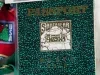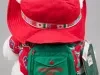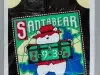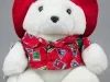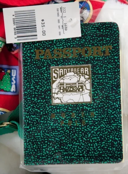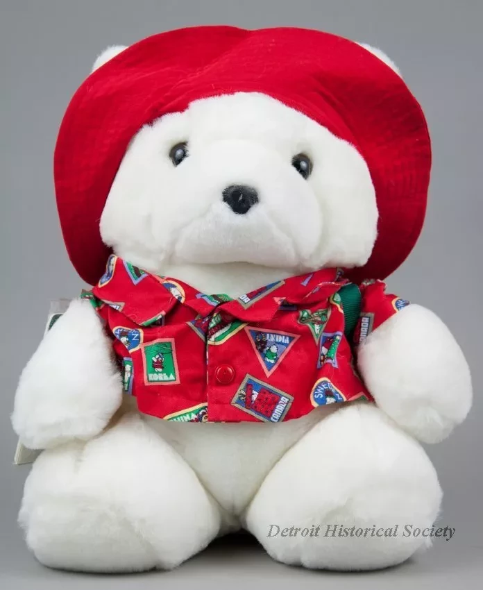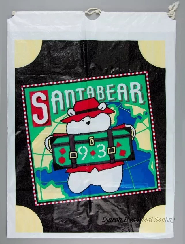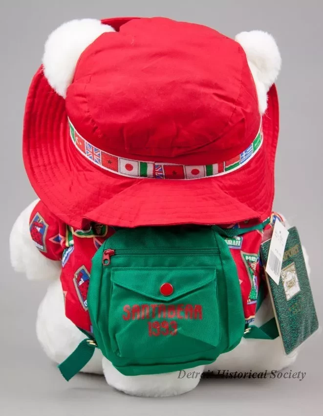 One Santa Bear stuffed animal which was sold as a promotional item by the Dayton Hudson Company as part of their 1993 Christmas holiday marketing campaign. The teddy bear toy is made of white polyester fiber with black plastic eyes and a black plastic nose. It is wearing a red fabric sun hat which has a multi-color headband with printed images of the flags of many countries of the world. It is also wearing a matching red jacket that is covered with multi-color print images of travel stickers from many countries. The bear also has a green nylon backpack with red text that reads "Santabear, 1993." A price tag in the amount of $35.00 is attached to the right shoulder along with an unopened clear plastic envelope that contains travel stickers and a Santabear "Passport" from the "North Pole." A white fabric tag on the underside has black text that shows the manufacturer's name, address, material description, and registration details. The bear comes with a white plastic bag that is printed with multi-color images of Santabear on the outside and has a white drawstring at the top.