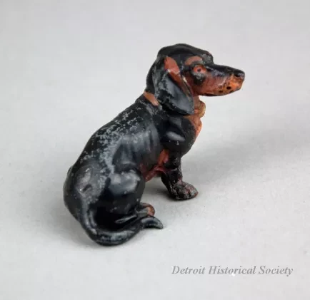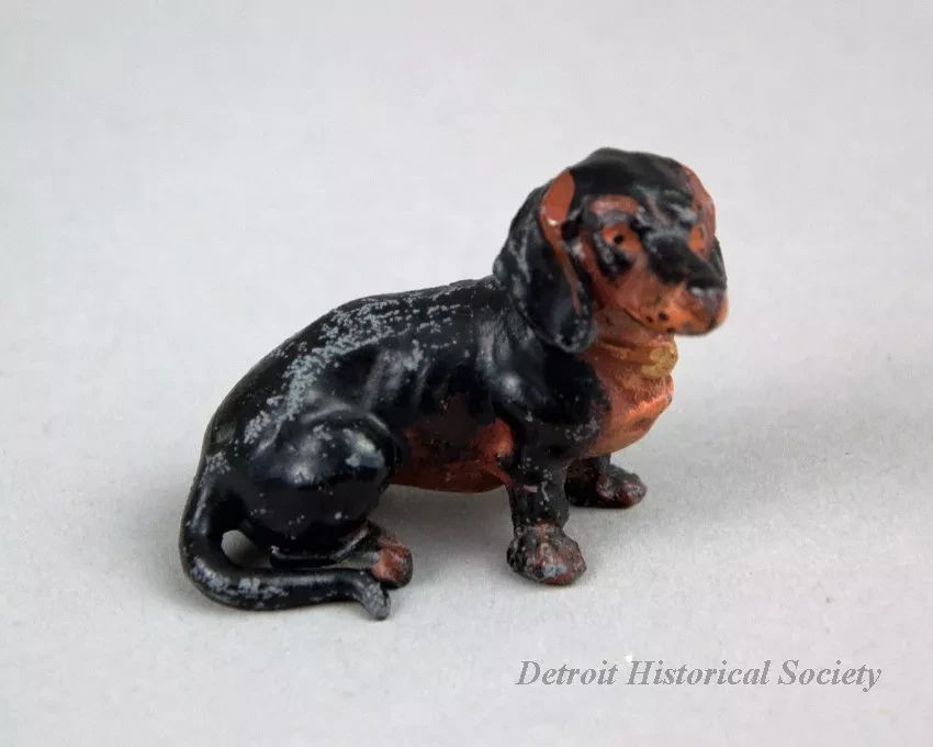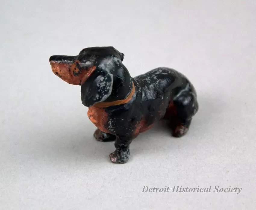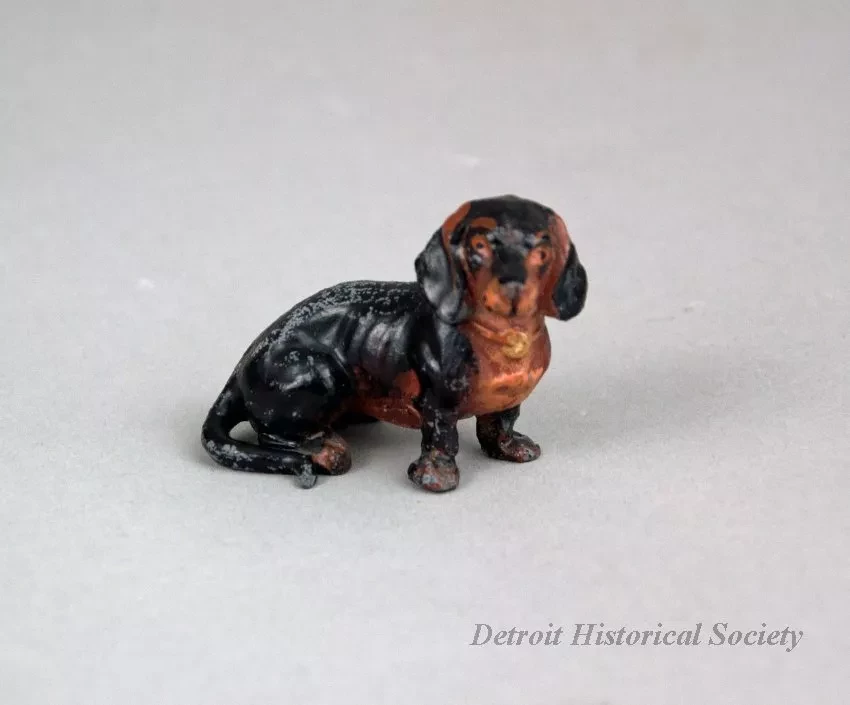 Dachshund figure made of cast metal. Painted brown with pinkish chest, belly, underside of snout, and inside of ears. Collar has same pinkish brown color as chest, with gold "license".