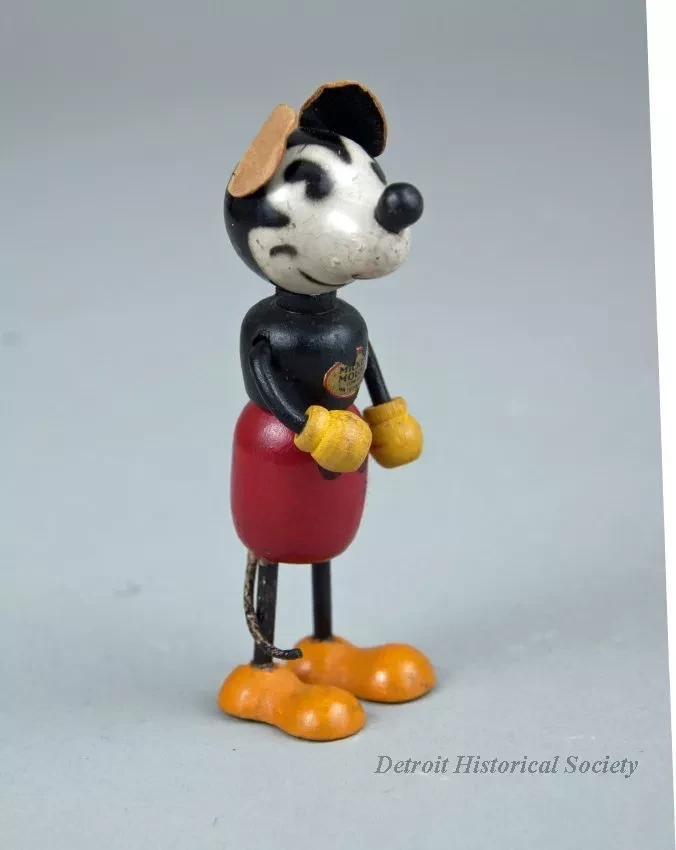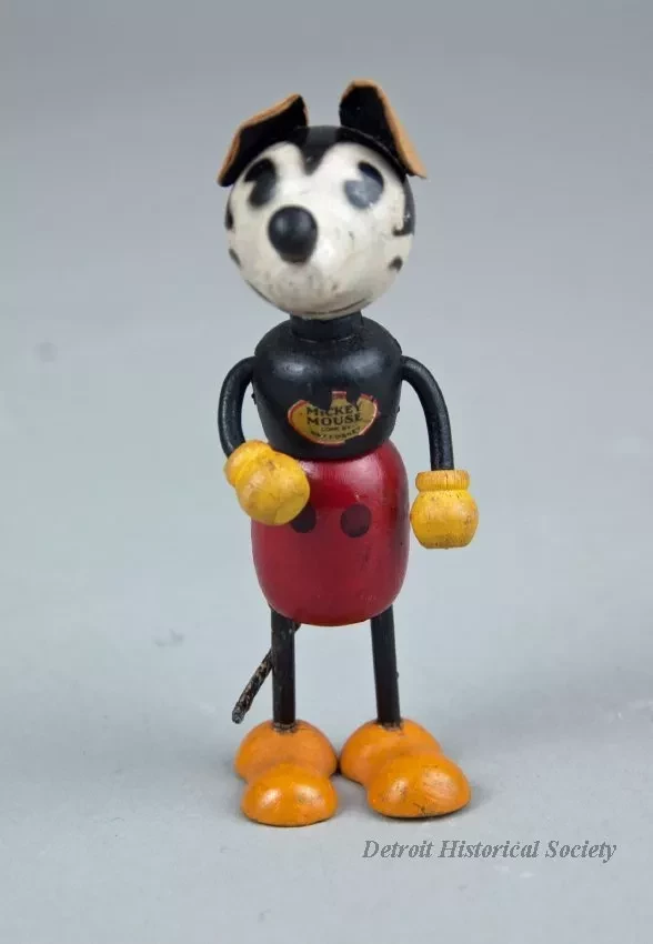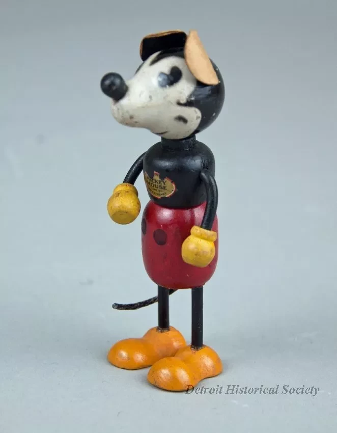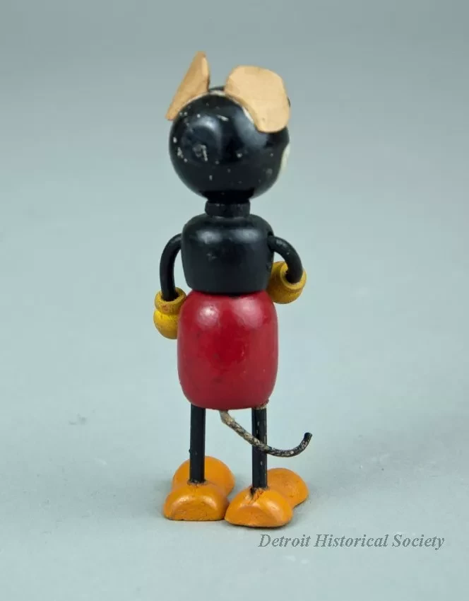 Mickey Mouse character doll made of wood with cardboard ears; Has black body, white face, yellow hands, orange shoes, red shorts, and black buttons; Label on chest reads "MICKEY MOUSE, COPR. BY WALT E. DISNEY."