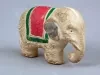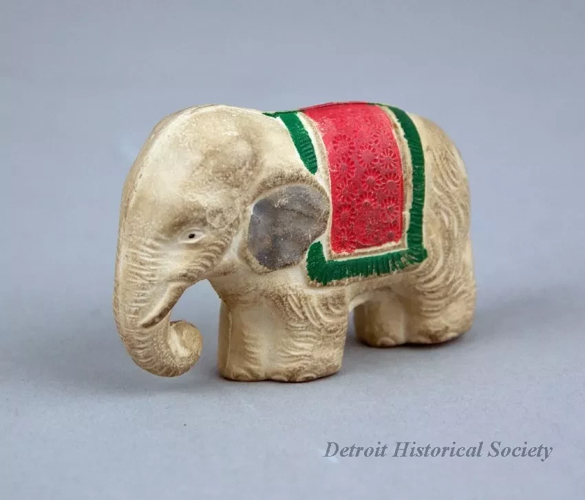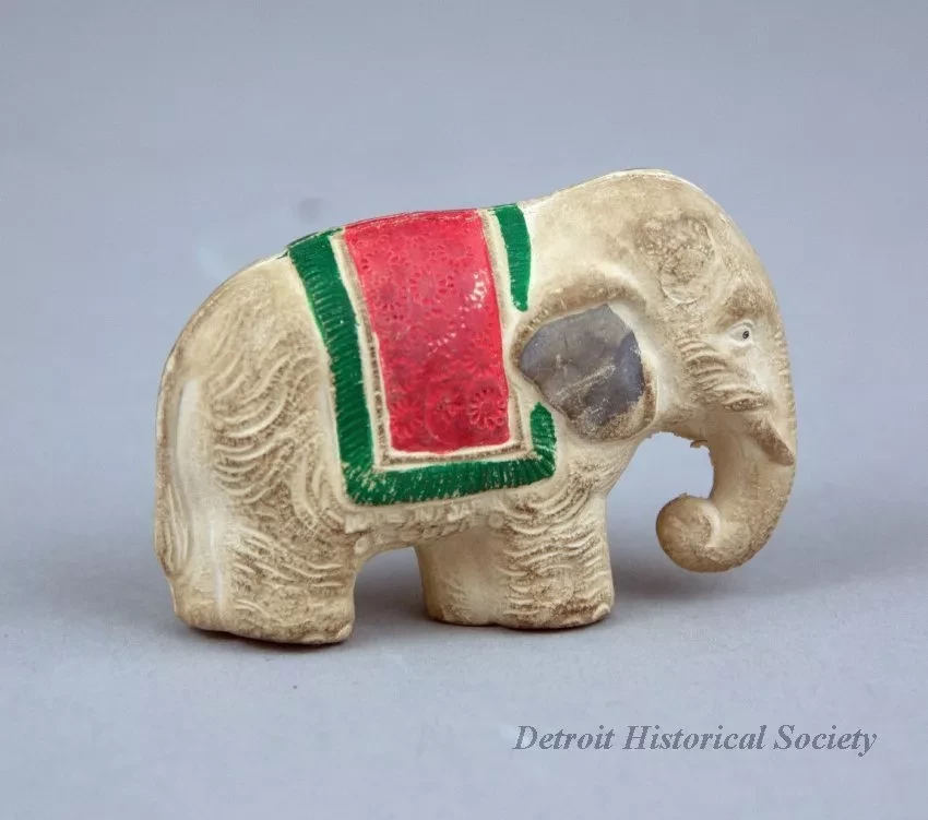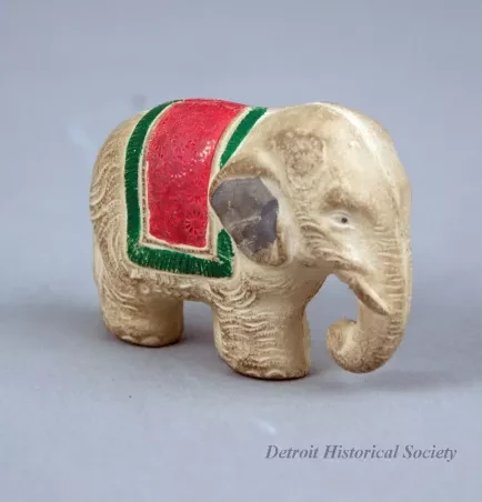 Miniature elephant made of rubber. Has light gray or white body with dark gray ears. Has a red and green painted blanket on back. Stamped on side: "Made in Jap[an] / Occupied / 269".
