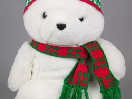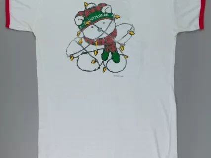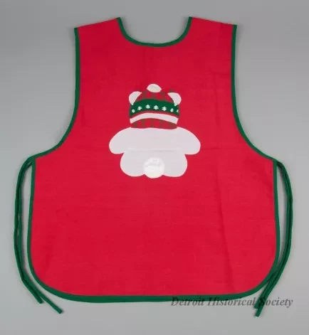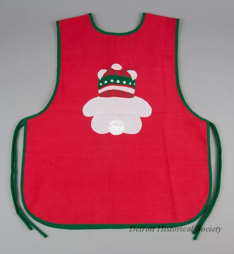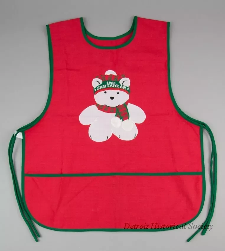 One Santa Bear apron which was sold as a promotional item by the Dayton Hudson Company as part of their 1986 Christmas holiday marketing campaign. The holiday apron fits over the head and is made of red linen/polyester fabric. It has a front and back with pockets across the lower front and narrow green fabric edging all around with matching green fabric ties at the sides. A red/white/green "Santabear" applique is sewn on the center front and back. Embroidered white text on the front applique reads "1986 Santabear." A manufacturer's tag on the inside right back reads "Made in the Philippines for W-C Imports, Inc.," and gives fabric care instructions.