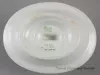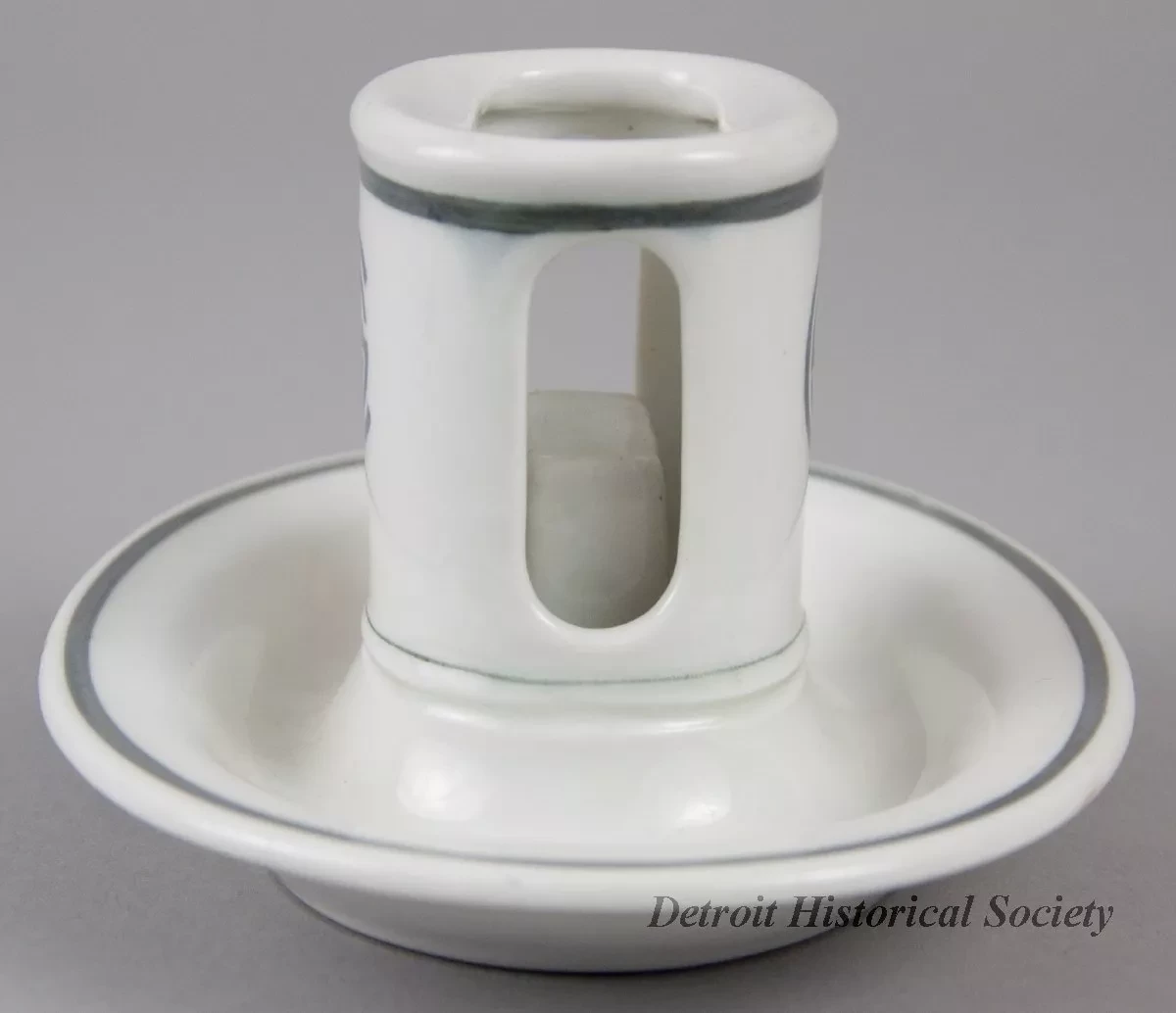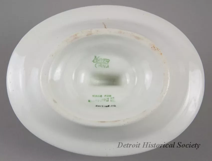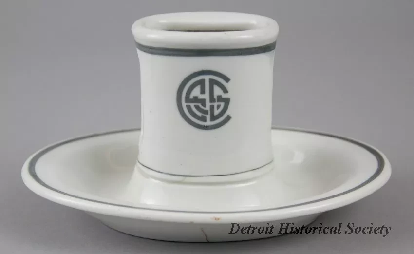 One ashtray and matchbook holder which may have come from the steamship, SS ALLEGHENY. The oval-shaped ashtray is made of heavyweight, white glazed china. It has a narrow, slightly-upturned rim with an oval-shaped, upright matchbook holder at the center. A narrow dark gray stripe encircles the ashtray along the outer edge of the rim. Narrow dark gray stripes also encircle the matchbook holder at the top edge and base. The two long sides of the holder are stamped with a gray "USSC" logo. The underside of the ashtray is stamped with green text that reads "Mayer China" and "Made for Union Supply Company."