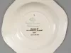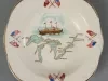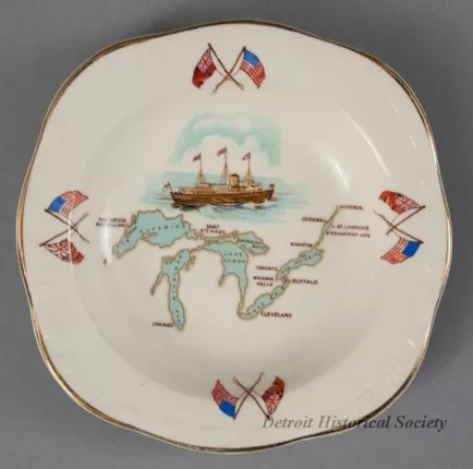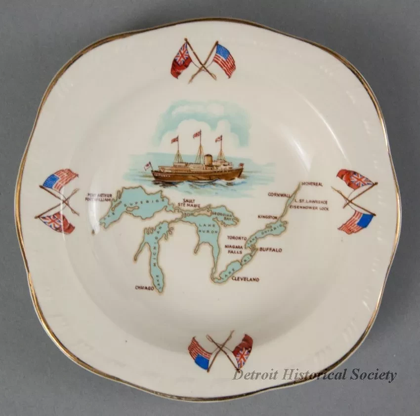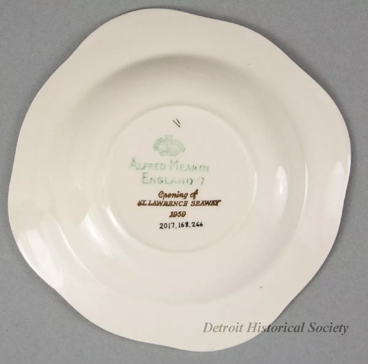 One small souvenir ashtray that commemorates the opening of the St. Lawrence Seaway in 1959. The round ashtray is made of thin glazed white china. It has rounded sides and a slightly-upturned rim with a scalloped edge that is decorated with a narrow gold-colored stripe. The outer top surface of the rim has a faint, rope-like pattern. Also, four evenly-spaced color images of crossed American and Canadian flags are also shown along the rim. At the center of the ashtray, a multi-color drawing of the yacht, BRITTANIA, is shown along with a map of the Great Lakes and St. Lawrence River. The underside is stamped with a small crown logo and green text that reads "Alfred Meakin, England,"