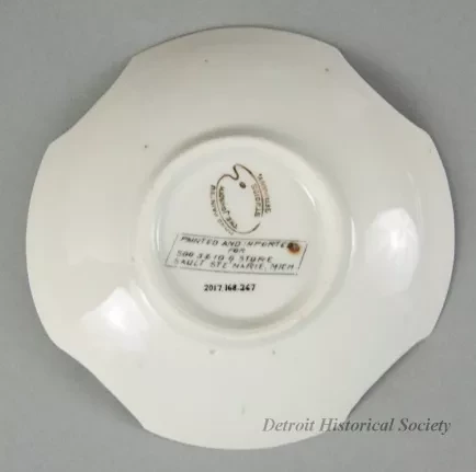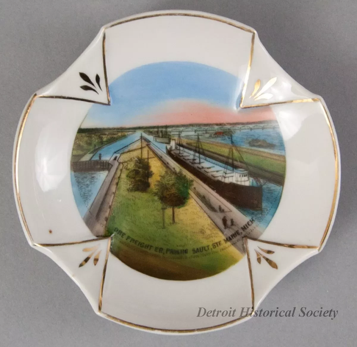 One small souvenir ashtray from the ship locks in Sault Ste. Marie, Michigan. The round ashtray is made of thin white glazed china. It has rounded sides, four evenly-spaced indentations along the outer edge (for resting a cigar or cigarette), and a small circular base. A gold-colored stripe is painted along the outer edge. Gold-colored stripes at the indentations form an inward-facing point and include a small fleur de lis decoration. At the center of the ashtray, a multi-color drawing of the locks and two steamships is shown along with black text that reads "Ore Freighter Passing: Sault Ste. Marie, Mich." The underside is stamped with an artist palette logo and gold-colored text that reads "Hand Painted," and "The Jonroth Studios, Germany." Additional printed black text reads "Printed and Imported for Soo 5 & 10¢ Store, Sault Ste. Marie, Mich."