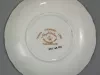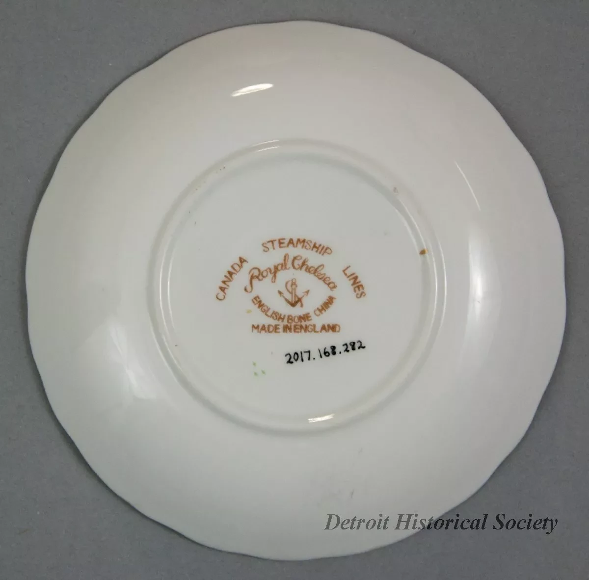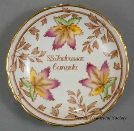 One small ashtray from the passenger steamship, SS Tadoussac, of Canada Steamship Lines. The round ashtray is made of glazed white china. It has curved sides and a scalloped top edge that has a narrow gold-colored stripe. Just below the top edge, a narrow brown stripe that resembles a tree branch, encircles the ashtray. Multi-color images of leaves hang from this branch toward the center of the tray. Brown script text at the center reads "S.S. Tadoussac, Canada." Brown printed text on the underside reads "Canada Steamship Lines," and "Royal Chelsea English Bone China, Made in England."