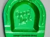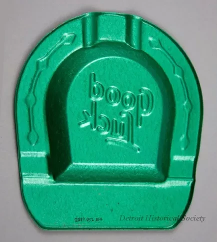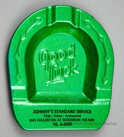 One metal ashtray from "Johnny's Standard Service." The ashtray is made of thin stamped steel that resembles a horseshoe along the top edge. It is painted green and the center bottom is stamped with raised text that reads "Good Luck." The lower edge is stamped with black text that reads "Johnny's Standard Service, Tires-Tubes-Accessories, 1601 Fullerton at Woodrow Wilson, TO.6-3200."