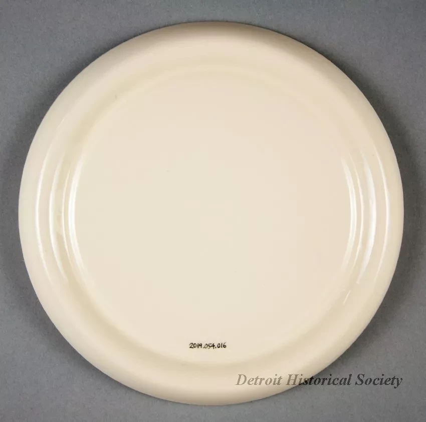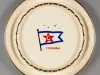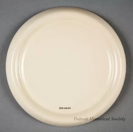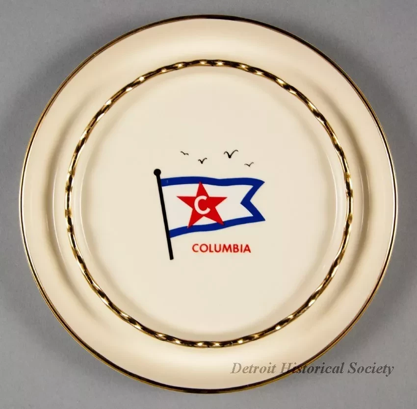 One ashtray used as an advertisement giveaway. It promoted the steamships of the Columbia Transportation Division of Oglebay Norton Company. The large circular ashtray is made of heavyweight glazed china of a bone/ivory color. It has short curved sides with a rounded top edge and a short circular base. The ashtray includes an inner circular ridge with 22 evenly-spaced notches for holding cigarettes. The top edges of the outer and inner circles are each painted with narrow gold-colored stripes. A red/white/blue image of the company house flag is painted on the flat bottom at the center of the ashtray along with red text that reads "Columbia." No manufacturer's name or marks are shown.
