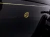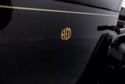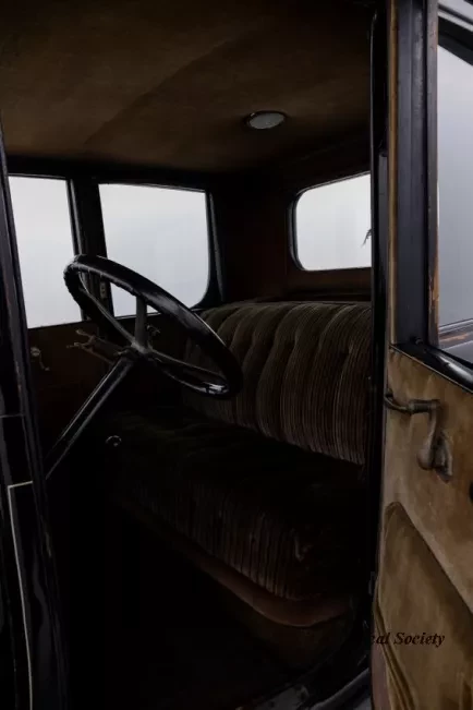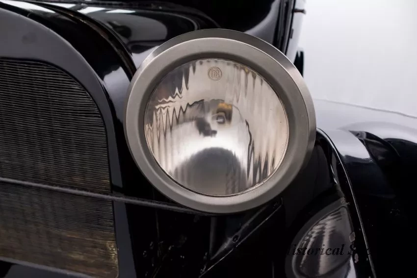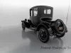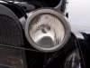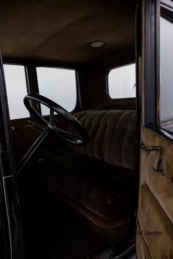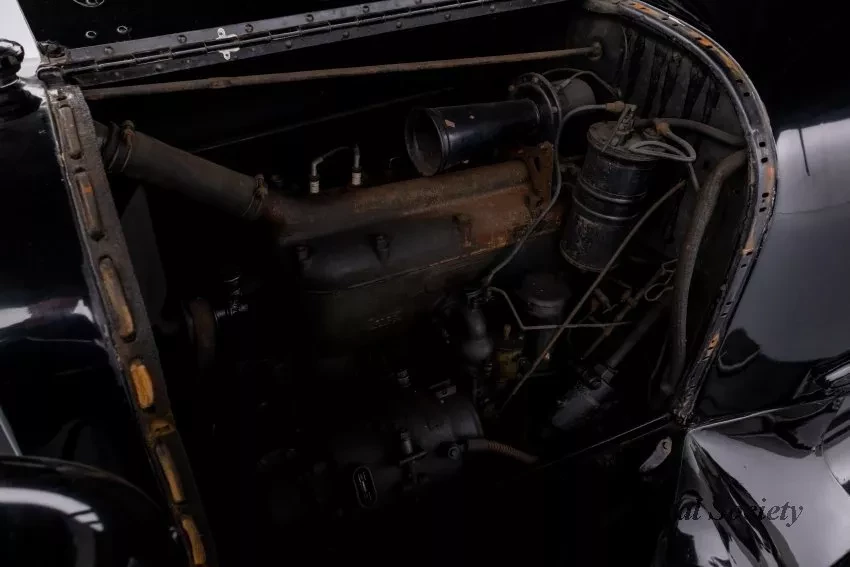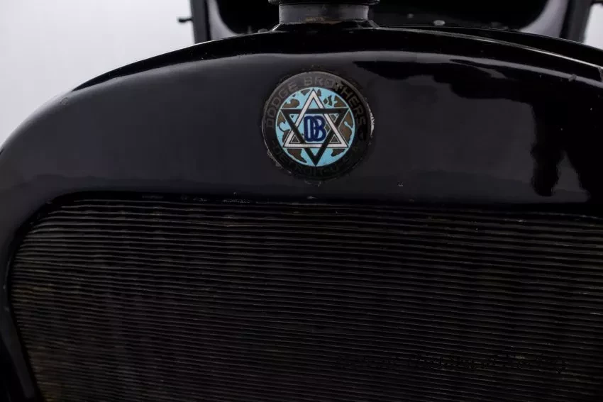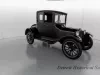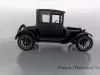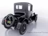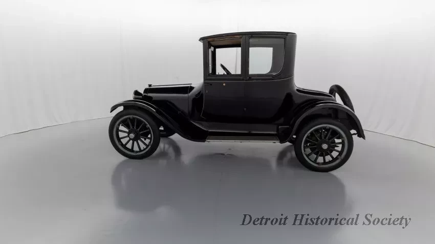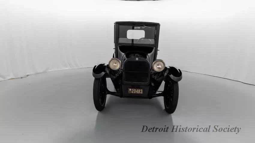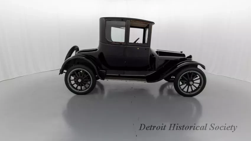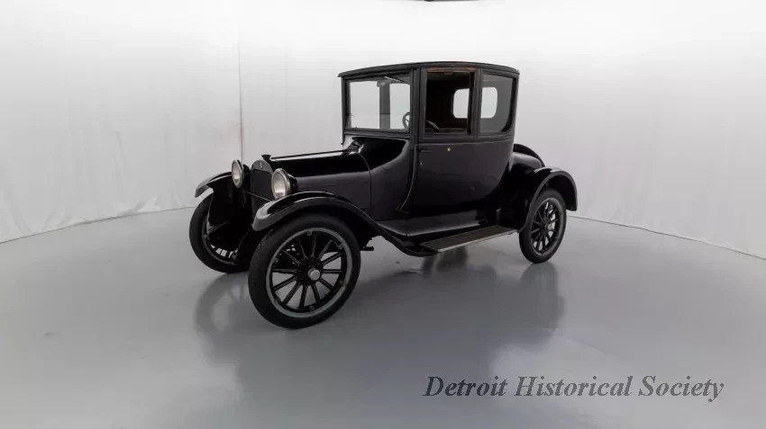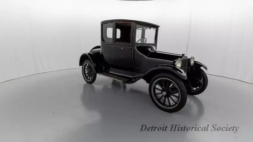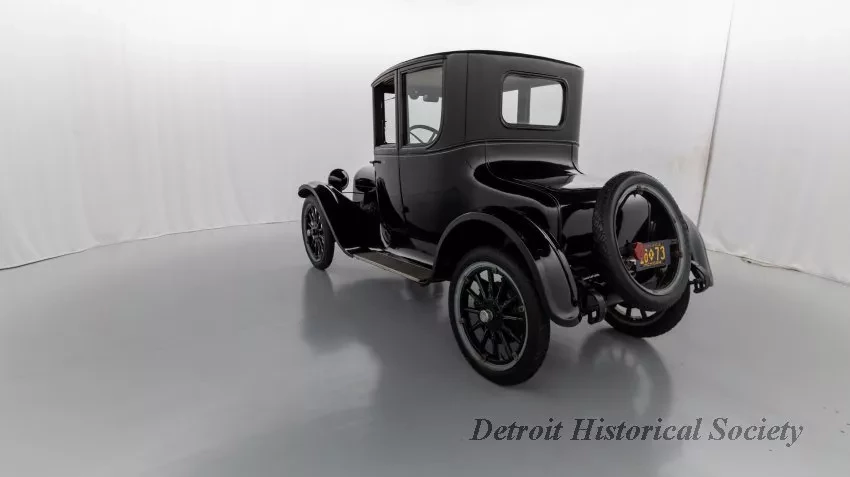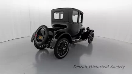 1919 Dodge Coupe used by Mr. Horace E. Dodge prior to his death in 1920. The automobile is black in color with thin cream striping along the panels. There is one door on either side and there is a wheel attached to the back. It has a blue and yellow license plate that reads "16X73."