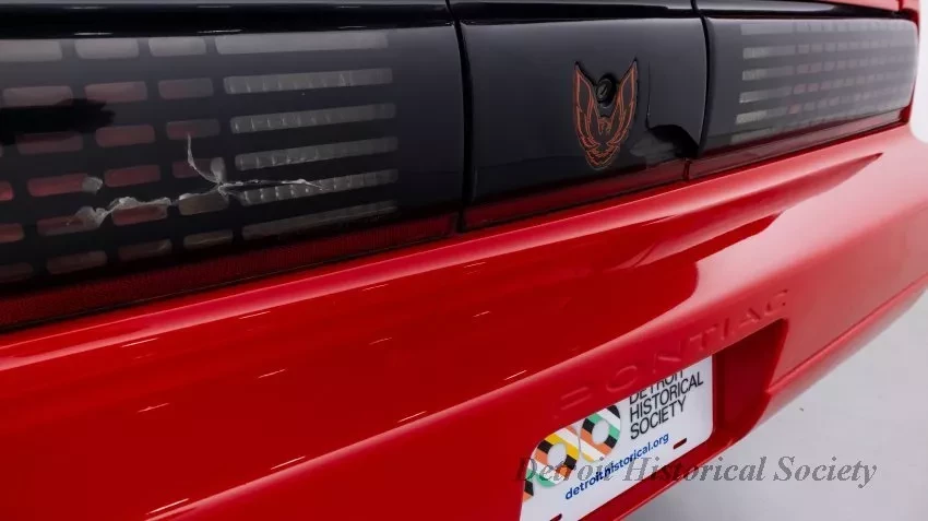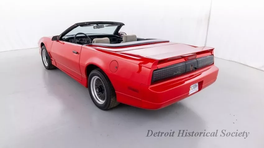 Automobile. 1986 Pontiac Trans Am Convertible. This car is one of three prototypes that was produced by A.S.C. (American Sunroof Corporation). It has a red body, black canvas roof, gray interior, black honeycomb wheels. It is in original, unrestored condition.