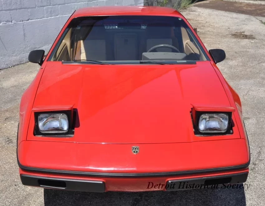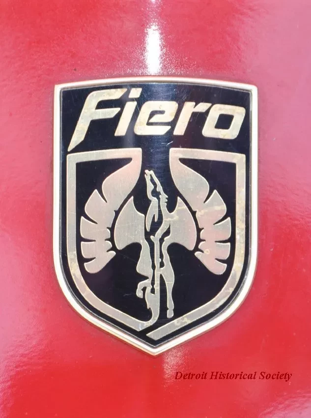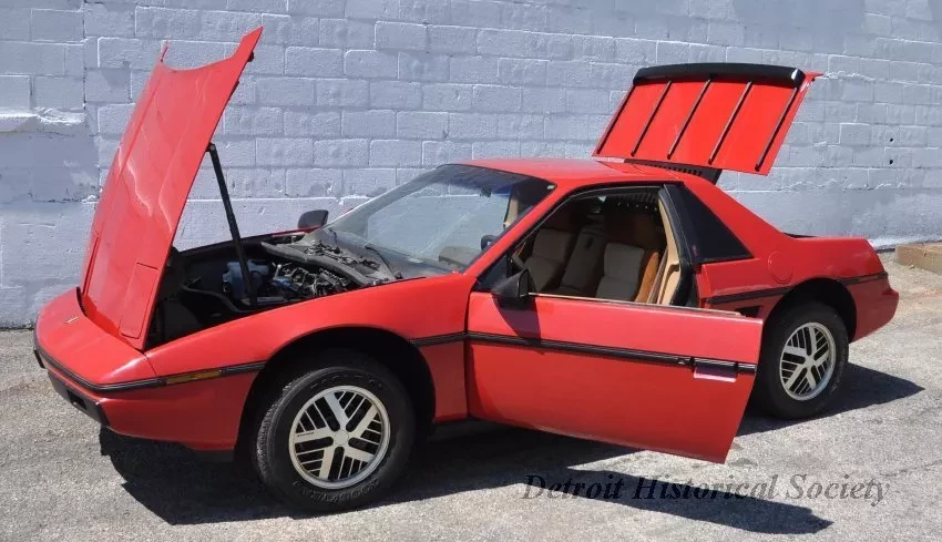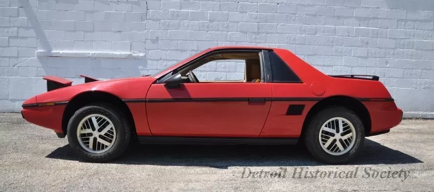 Automobile. 1984 Pontiac Fiero 2M4,Bright red composite plastic body. First year production for Fiero. Vehicle number is 1G2AF37R6EP200053. (Based upon the low VIN number, this car may have been used for testing or promotional purposes.) This two-door, two-passenger vehicle has a mid-engine design and center floor console with stick shift, concealed headlight, power windows and tape deck. It has brown suede and natural sheepskin bucket seats.