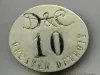 One employee identification badge from the passenger steamship, SS GREATER DETROIT, of the Detroit & Cleveland Navigation Company (D&C Line). The oval-shaped badge is made of nickel-plated steel. The front surface is slightly convex and is stamped with black text that reads "D&C, 10, Greater Detroit." The back has a clasp-type pin for attachment to clothing. No manufacturer's name or marks are shown.