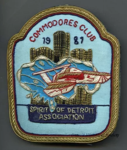 One jacket badge for the "Commodores Club, 1987" of the "Spirit of Detroit Association." The decorative, shield-shaped badge shows a hydroplane and the Renaissance Center towers at the center. The images are made of fine thread and gold braid on a blue fabric background. Fine thread and gold braid are also used to form a decorative rope border. The badge has a layer of cardboard at the center with a black fabric backing. The back includes three brass pins with spring clips for attachment to a blazer or jacket. A separate small printed paper card gives handling instructions.